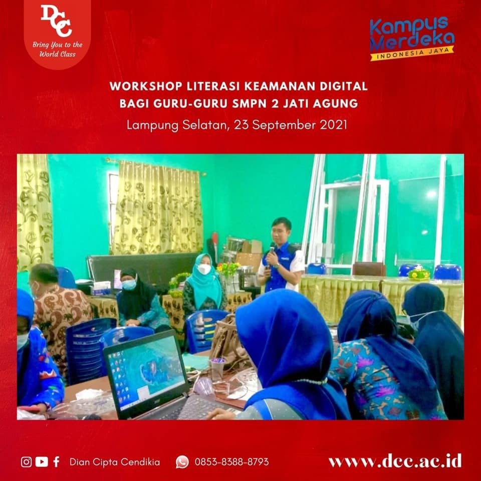 Dalam rangka melaksanakan Tri Dharma Perguruan Tinggi, beberapa dosen tetap ABA Dian Cipta Cendikia dan AMIK Dian Cipta Cendikia berkolaborasi mengadakan workshop tentang Literasi Keamanan Digital bagi Guru Guru di SMPN 2 Jati Agung, Lampung Selatan pada hari Kamis, 23 September 2021. Alhamdulillah kegiatan workshop ini berjalan dengan lancar dan seluruh peserta sangat antusias.