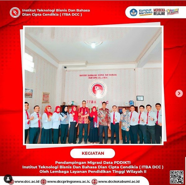 Pendampingan Migrasi Data PDDIKTI Institut Teknologi Bisnis Dan Bahasa Dian Cipta Cendikia (ITBA DCC) bersama Lembaga Layanan Pendidikan Tinggi Wilayah II, yang diselenggarakan pada Kamis, 22 Desember 2022 bertempat di kampus utama Institut Teknologi Bisnis Dan Bahasa Dian Cipta Cendikia (ITBA DCC).