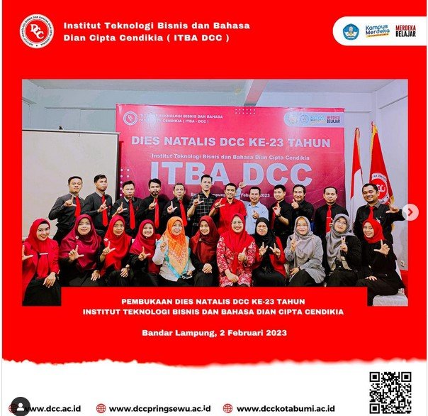 Pada hari Kamis tanggal 2 Februari 2023, sivitas akademika Institut Teknologi Bisnis dan Bahasa Dian Cipta Cendikia (ITBA-DCC) menghadiri Pembukaan Dies Natalis yang ke-23 tahun. Usia ini dihitung berdasarkan pendirian awal Perguruan Tinggi untuk pertama kalinya yaitu ABA DCC dan AMIK DCC pada tahun 2000. Sedangkan tanggal 18 Februari disepakati sebagai Dies Natalis Perguruan Tinggi karena merupakan sejarah awal berdirinya Lembaga Pendidikan Dian Cipta Cendikia pada tanggal 18 Februari 1994.