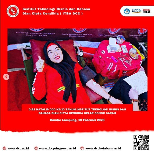 Dalam rangka memperingati Dies Natalis ke-23, Institut Teknologi Bisnis dan Bahasa Dian Cipta Cendikia (ITBA-DCC) menggelar kegiatan senam sehat dan bhakti sosial donor darah kolaborasi dengan Palang Merah Indonesia (PMI) Provinsi Lampung. Kegiatan diselenggarakan di Gedung Kampus ITBA-DCC, Jum'at (10/2/2023).