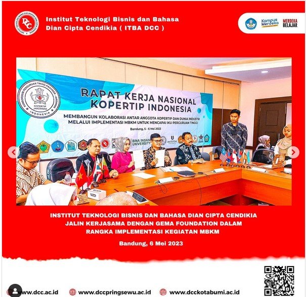 Institut Teknologi Bisnis dan Bahasa Dian Cipta Cendikia (ITBADCC) mengikuti Rapat Kerja Nasional Konsorsium PT Jardiknas "KOPERTIP INDONESIA" yang dilaksankan pasa Jum' at- Sabtu, 5 - 6 Mei 2023 di Gedung B - Seameo QTEP in Science BBGP Jawa Barat.