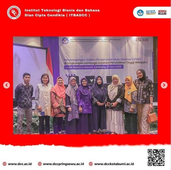 Institut Teknologi Bisnis dan Bahasa Dian Cipta Cendikia (ITBADCC) mengikuti kegitan Pendampingan Sistem Penjaminan Mutu Internal (SPMI) bagi Perguruan Tinggi di Lingkungan Lembaga Layanan Pendidikan Tinggi (LLDIKTI) Wilayah II yang dilaksanakan di Ballroom Hotel Sheraton, pada hari Selasa (27/06/23).