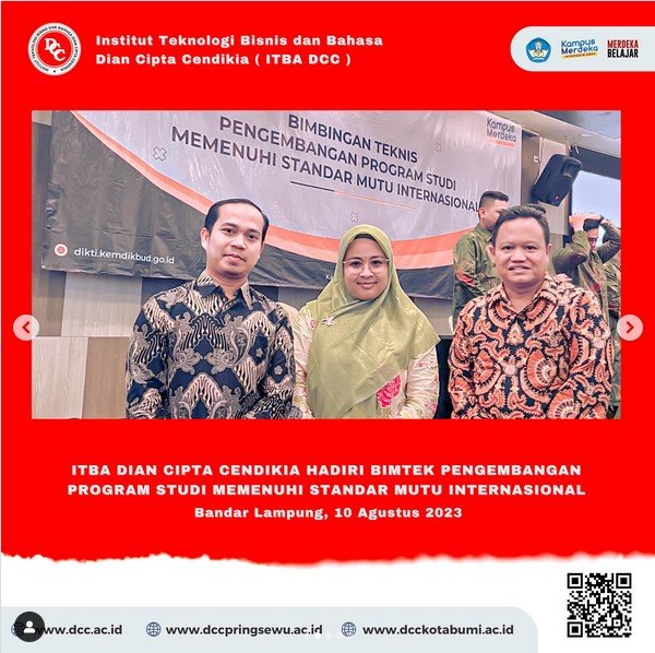 Institut Teknologi Bisnis dan Bahasa Dian Cipta Cendikia (ITBADCC) mengikuti kegiatan Bimbingan Teknis Pengembangan Program Studi Memenuhi Standar Mutu Internasional bagi Perguruan Tinggi di Lingkungan Lembaga Layanan Pendidikan Tinggi (LLDIKTI) Wilayah Il yang dilaksanakan di Novotel Lampung pada hari Kamis (10/8/23).