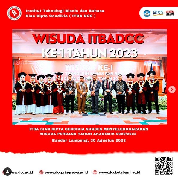 ITBA DCC Pada Rabu, 30 Agustus 2023, Institut Teknologi Bisnis dan Bahasa Dian Cipta Cendikia (ITBA DCC) sukses melaksanakan wisuda perdana yang berlangsung di Aula Graha Parahita Marcopolo, Jalan Diponegoro No. 3, Sumur Batu, Kecamatan Teluk Betung Selatan, Kota Bandar Lampung. Sebanyak 143 wisudawan dan wisudawati dari ITBA DCC berpartisipasi dalam acara bersejarah ini.