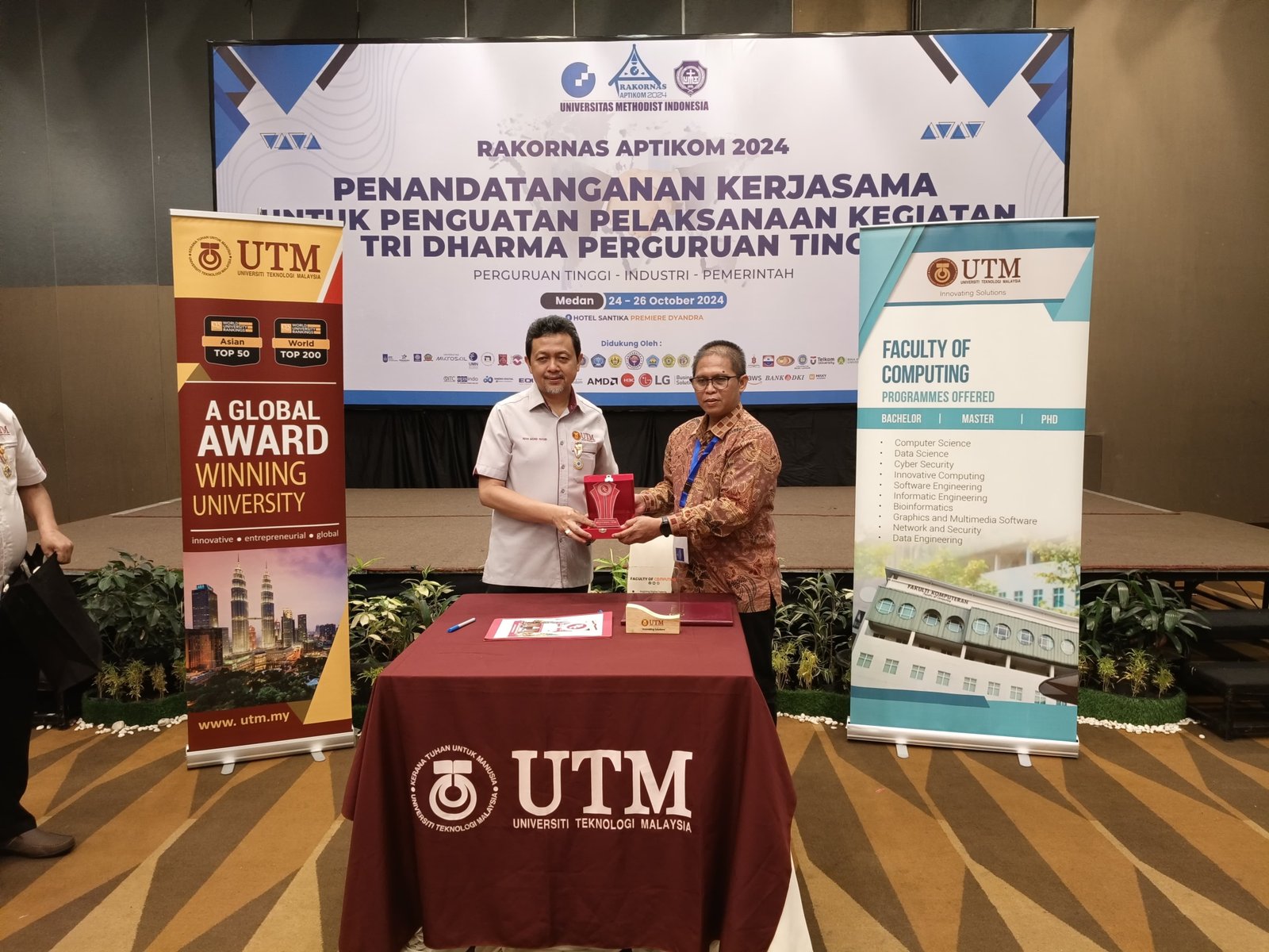 Medan - 25/10/2024 - Dalam rangka meningkatkan Program Merdeka Belajar Kampus Merdeka dan melaksanakan Tridharma Perguruan Tinggi serta meningkatkan kualitas sistem pendidikan di Perguruan Tinggi, Institut Teknologi Bisnis dan Bahasa (ITBA) Dian Cipta Cendikia Bandar Lampung dan Universiti Teknologi Malaysia (UTM) menggelar penandatanganan Leter Of Intent (LOI) pada Jumat, 25 Oktober 2024 yang dilaksanakan pada acara Rapat Koordinasi Nasional Asosiasi Perguruan Tinggi Komputer (Rakornas Aptikom) di Kota Medan.