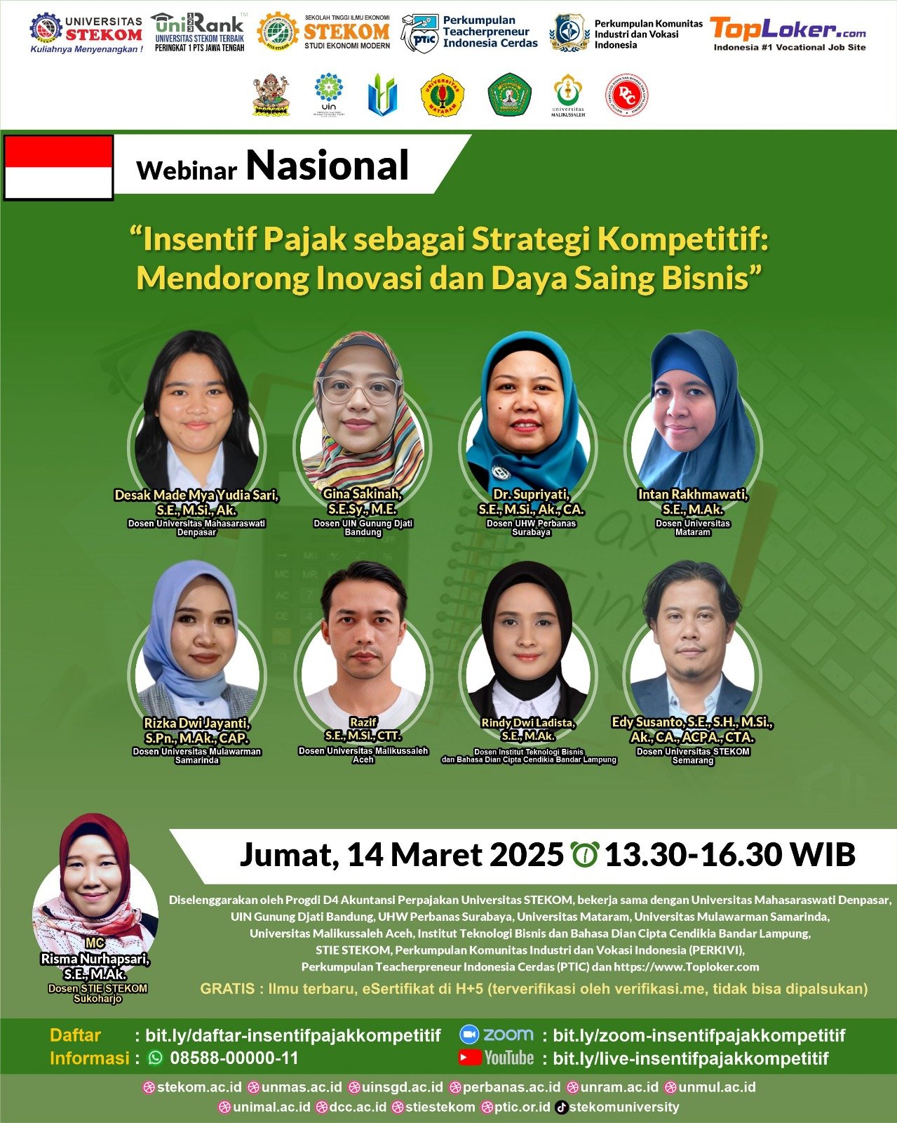 Dalam rangka meningkatkan pemahaman tentang peran insentif pajak dalam mendorong inovasi dan daya saing bisnis, Program Studi D4 Akuntansi Perpajakan Universitas Sains dan Teknologi Komputer (Universitas STEKOM) mengadakan Webinar Nasional bertajuk "Insentif Pajak sebagai Strategi Kompetitif: Mendorong Inovasi dan Daya Saing Bisnis". Acara ini diselenggarakan pada Jumat, 14 Maret 2025, pukul 13.30-16.30 WIB melalui platform Zoom dan YouTube Live.